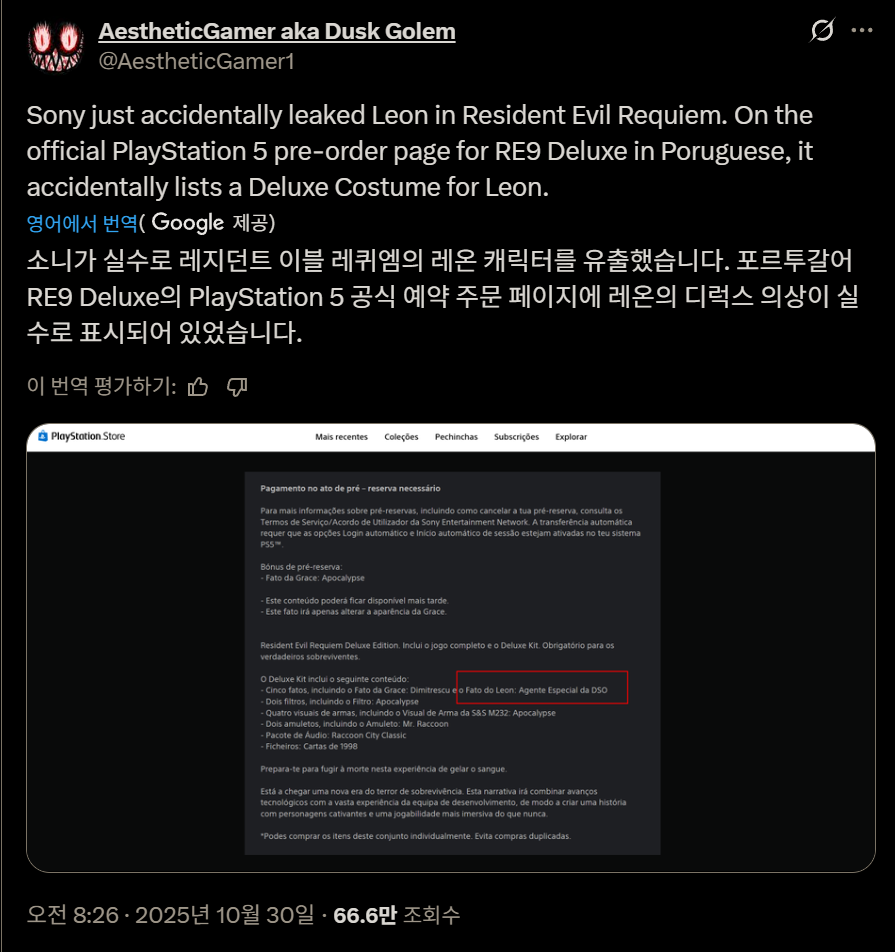 해당 페이지의 레지던트 이블 레퀴엠 디럭스 에디션 예약 구매 콘텐츠 목록에는 "레온 D.S.O. 특수 요원 스킨"이라는 독점 의상이 명시적으로 언급되어 있는 반면, 다른 지역 페이지의 설명에는 그레이스의 의상만 언급되어 있습니다.