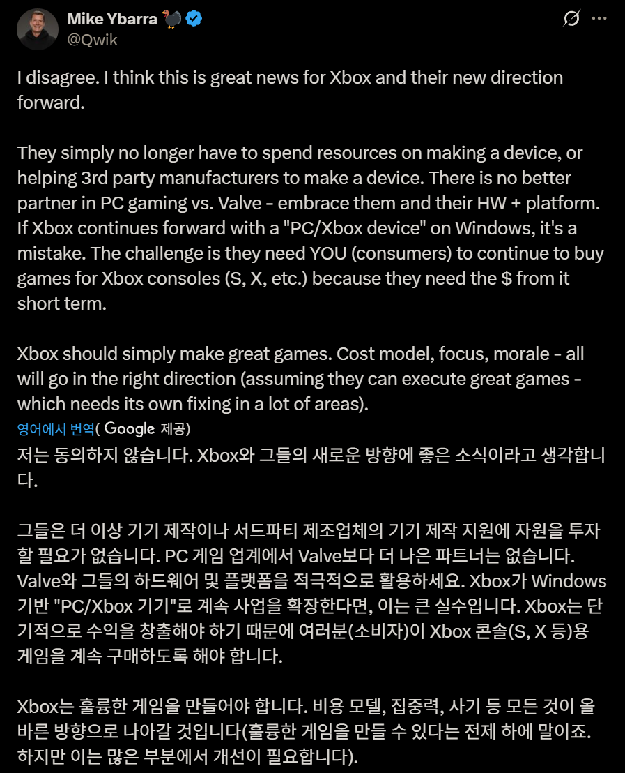 이바라는 소셜 미디어를 통해 Xbox가 자체 기기 개발이나 서드파티 제조업체 지원에 자원을 투자할 필요가 없다는 점을 지적했습니다.