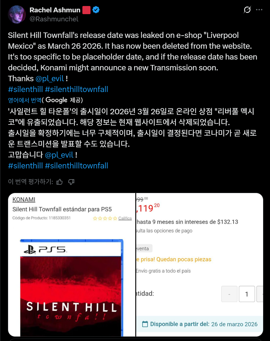 해당 플랫폼은 '사일런트 힐 타운폴'의 출시일을 2026년 3월 26일로 공표했습니다.
