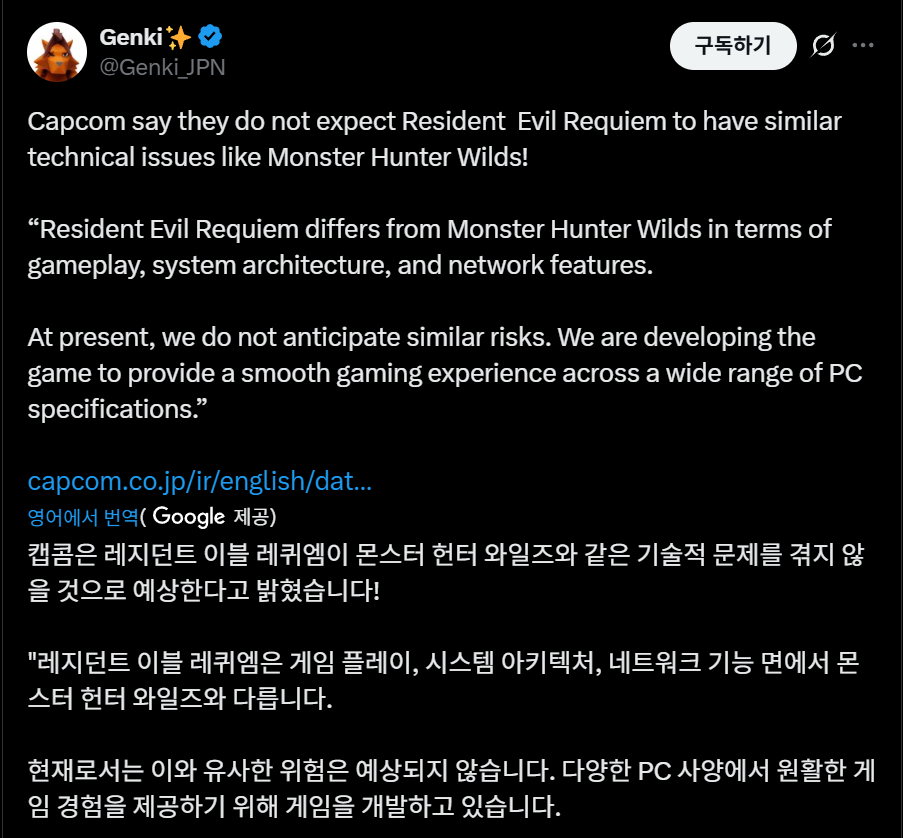 하지만 캡콤 개발진은 RE 엔진으로 제작된 최신 AAA 타이틀인 레지던트 이블 레퀴엠에 대해서는 플레이어들이 걱정할 필요가 없다고 밝혔습니다.