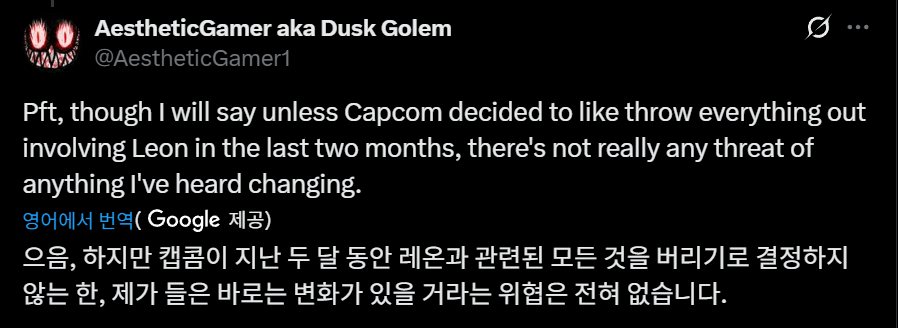 "흠, 하지만 캡콤이 지난 두 달 동안 레온 관련 콘텐츠를 완전히 포기하지 않는 한, 스토리 변경에 대한 소식은 전혀 듣지 못했습니다."