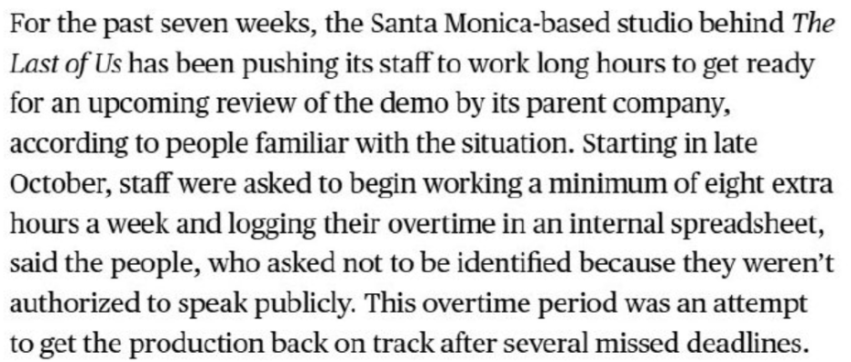 보도에서는 너티 독이 내부 데모 버전 개발을 가속화하고 이전의 출시 지연을 만회하기 위해 최근 대부분의 직원에게 초과 근무 제도를 도입했다고 밝혔습니다.