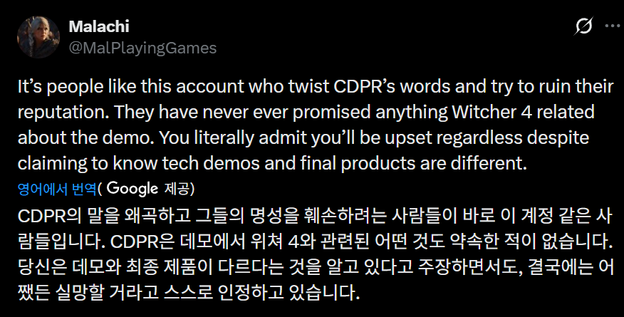그는 만약 최종 버전이 데모에서 보여준 수준에 미치지 못한다면, *더 위쳐 4*는 *사이버펑크 2077*처럼 "과대광고" 논란에 휩싸여 일부 플레이어들의 큰 불만을 초래할 수 있다고 우려했습니다.