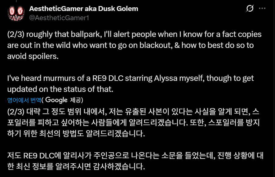 하지만 출시를 한 달 앞둔 시점에서 유명 유출자 Dusk Golem(Aesthetic Gamer)이 '바이오하자드: 레퀴엠'에 알리사 애쉬크로프트가 등장하는 DLC가 추가될 가능성을 제기하면서 전 세계 플레이어들 사이에서 뜨거운 논쟁이 벌어지고 있습니다.