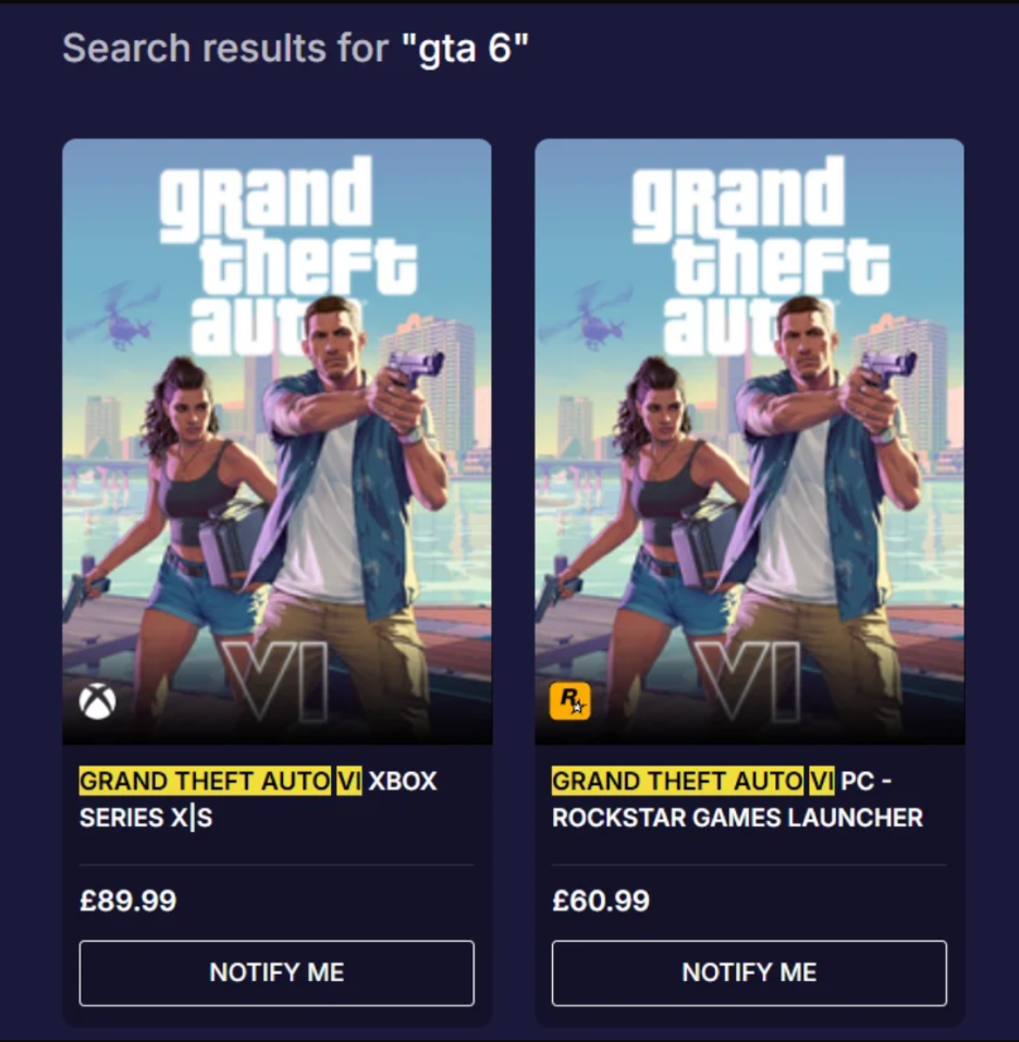 온라인 소매업체 Loaded는 Xbox Series X|S용 GTA 6를 약 89.99파운드, PC용을 약 60.99파운드에 판매하고 있습니다.