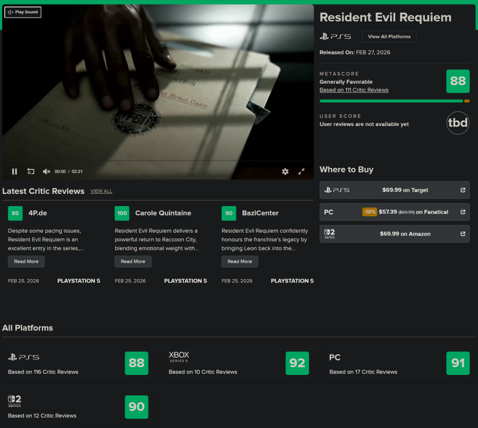 4.바이오하자드 레퀴엠, 메타크리틱에서 88점 획득: 서바이벌 호러의 또 다른 걸작, 시리즈의 정점을 보여주다!