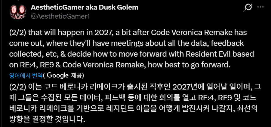 업계 관계자인 Dusk Golem에 따르면, 캡콤은 레지던트 이블: 코드 베로니카 리메이크 출시 이후인 2027년에 주요 내부 회의를 열어 레지던트 이블 시리즈의 미래 방향을 공식적으로 결정할 계획이라고 합니다.