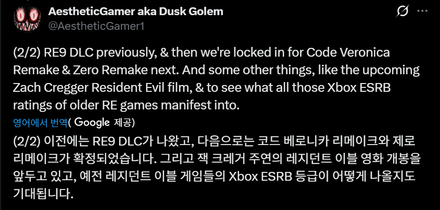 이 밖에도 잭 크레이그 감독의 레지던트 이블 영화 제작과 Xbox용 구작 레지던트 이블 게임들의 ESRB 등급 업데이트 등 다른 프로젝트들도 진행 중인데, 이러한 업데이트가 어떤 결과를 가져올지 기대해 볼 만합니다."라고 밝혔습니다.