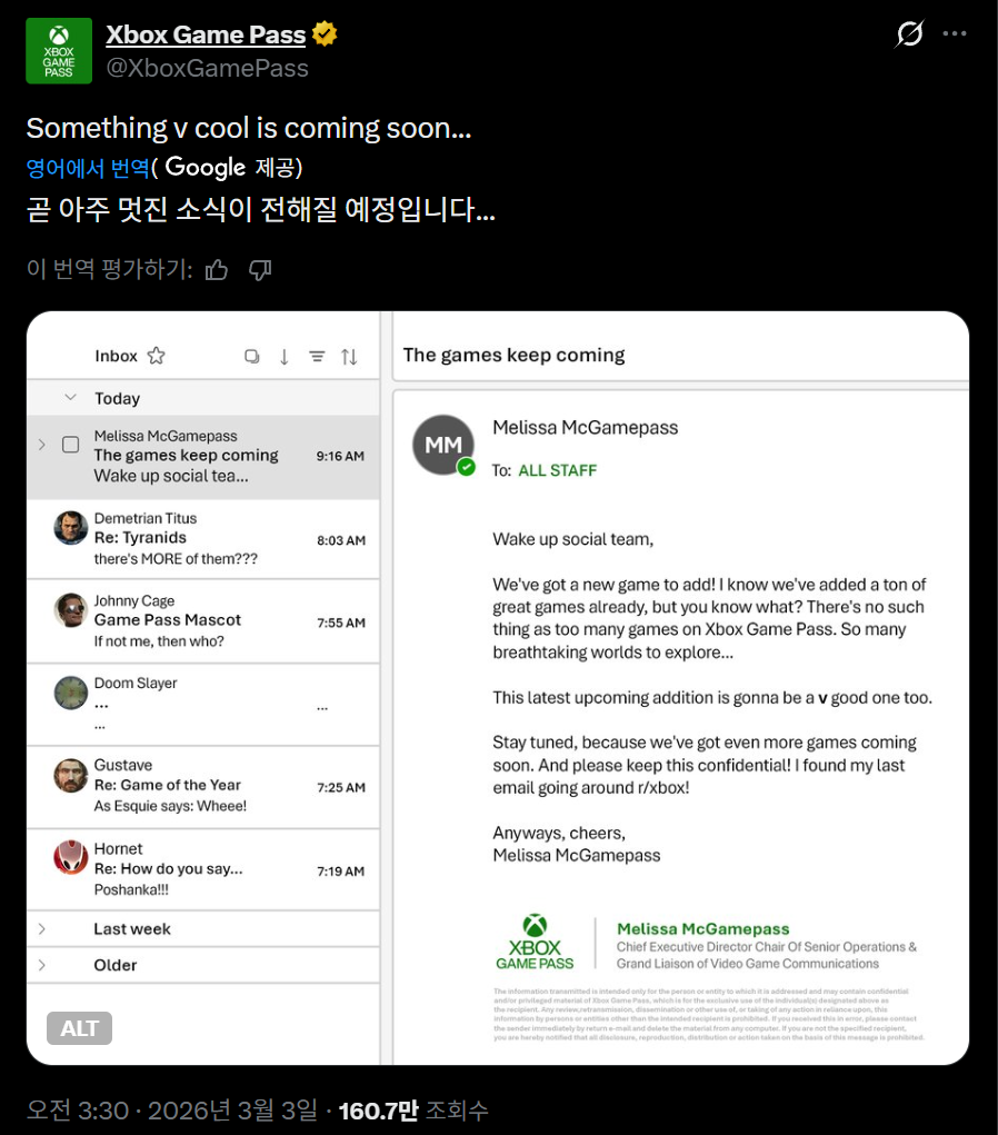 Insider Gaming에 따르면, 최근 마이크로소프트와 Xbox의 혼란에도 불구하고, 적어도 마이크로소프트의 가상 캐릭터인 멜리사 맥게임패스는 XGP에서 여전히 확고한 자리를 지키고 있다고 합니다.