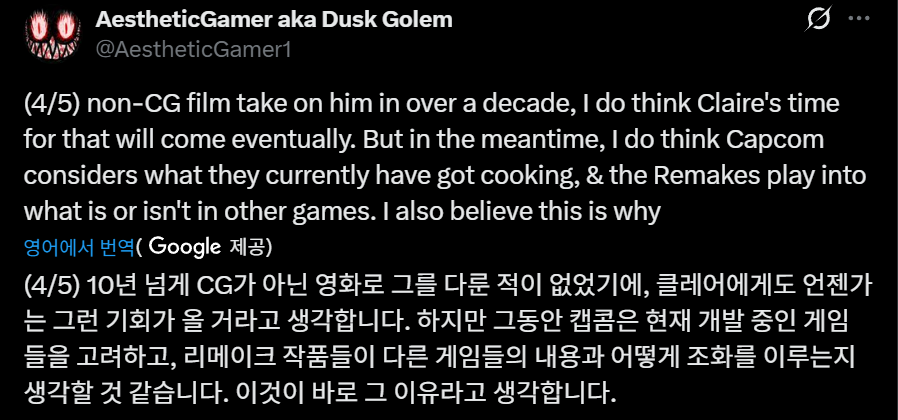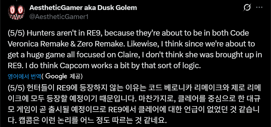 이에 대해 유출자 Dusk Golem은 캡콤이 시리즈의 차기작을 기획할 때 단기간에 같은 캐릭터를 과도하게 사용하는 것을 피한다고 밝혔습니다.