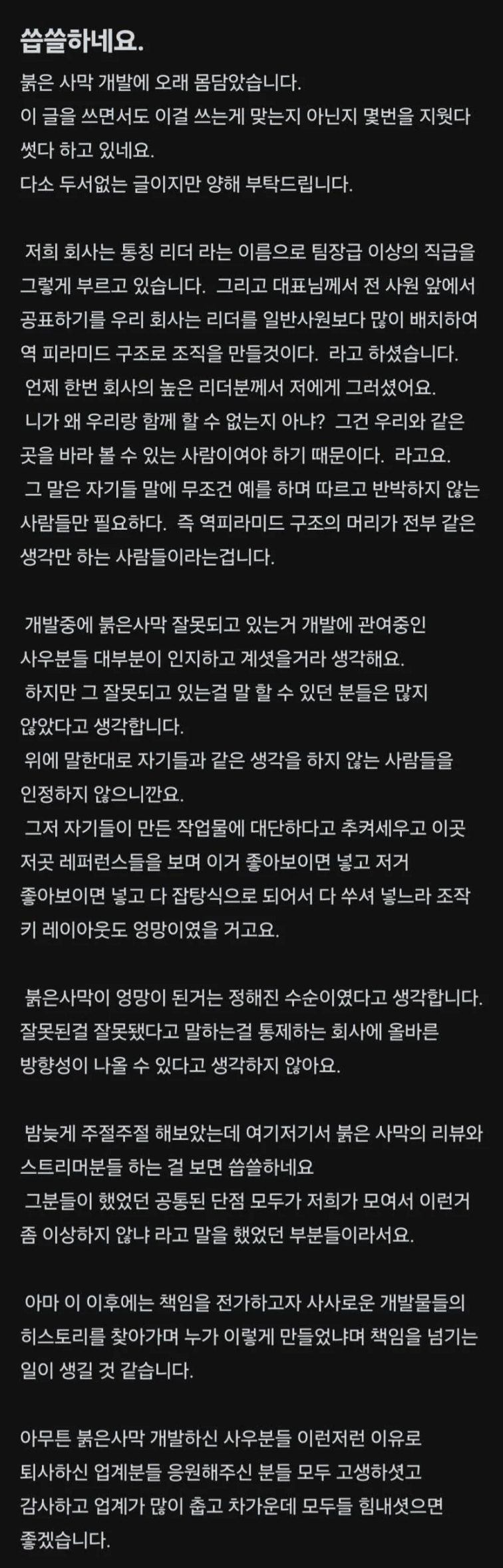 하지만 한편으로는 이러한 기업 문화 하에서는 훌륭한 게임이 만들어질 수 없다는 것을 증명하는 것이기에 안도감도 느낍니다.