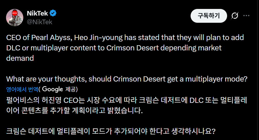 올해 2월, '붉은 사막' 개발사인 펄어비스의 허진영 대표는 한국 언론과의 인터뷰에서 시장 수요에 따라 DLC나 멀티플레이어 콘텐츠 등 추가 콘텐츠를 게임에 더할 계획이라고 밝혔습니다.