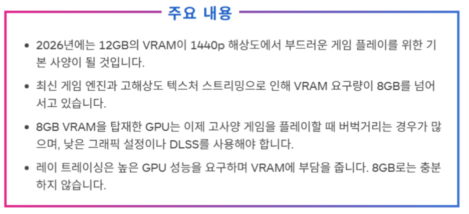 8GB 그래픽 카드로는 현재 이러한 게임들을 원활하게 플레이하기에도 부족하며, 앞으로 출시될 게임들까지 고려한다면 더욱 비효율적입니다.