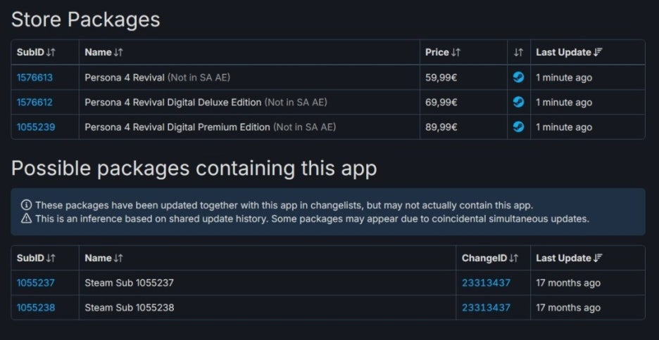오늘 한 플레이어가 게임 개발사인 Altus의 기대작 JRPG '페르소나 4: 리바이벌'에 대한 메타데이터가 스팀 데이터베이스(SteamDB)에 유출된 것을 발견했습니다.
