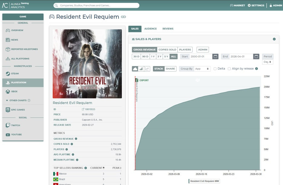 제3자 데이터 분석 업체인 알리네아 애널리틱스(Alinea Analytics)에 따르면, 바이오하자드 레퀴엠는 PS5 플랫폼에서 280만 장 이상 판매되어 2억 달러 이상의 매출을 올렸으며, 3월 한 달 동안에만 190만 장 이상이 판매되었습니다.