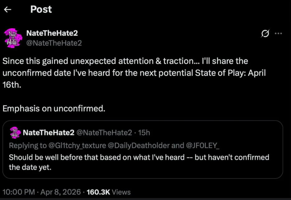 네이트 더 헤이트는 이것이 소문으로 떠도는 스테이트 오브 플레이 이벤트와 관련이 있는지는 알 수 없다고 밝혔습니다.