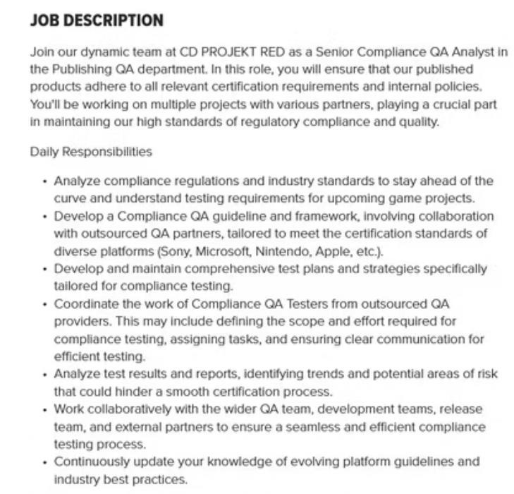 채용 요구 사항에는 곧 출시될 게임이 "다양한 플랫폼(Sony, Microsoft, Nintendo, Apple 등)에 대한 인증 표준을 충족"해야 한다는 필요성이 설명되어 있습니다.