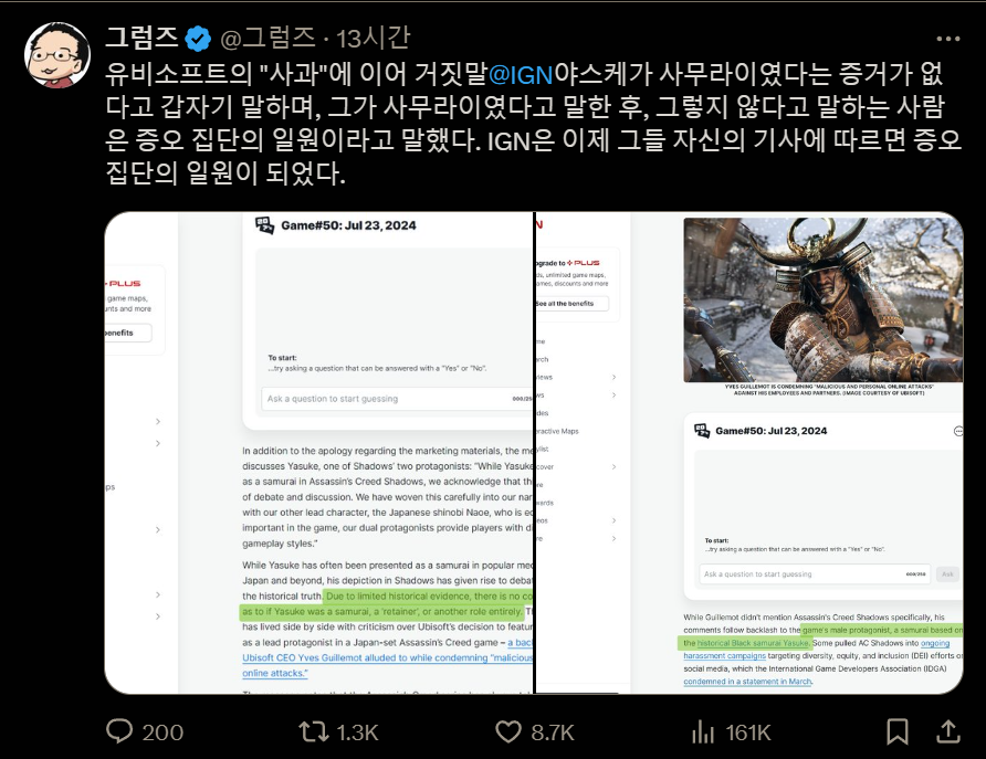 Grummz: IGN은 이전에 Yasuke가 사무라이이며 그렇지 않다고 말하는 사람은 모두 증오 집단의 일부라고 말했습니다.