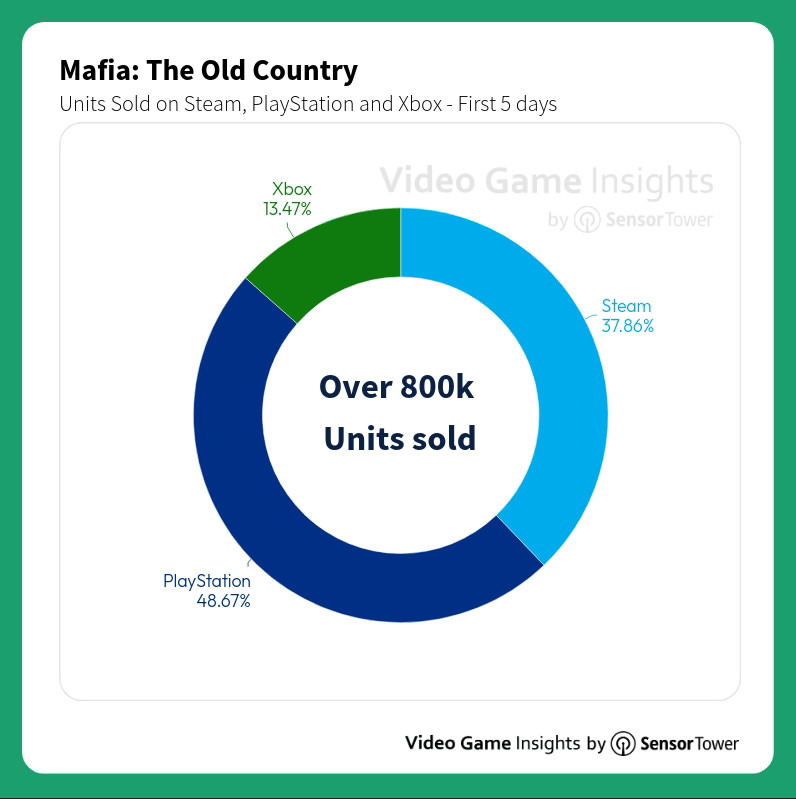 즉, 마피아 올드 컨트리는 출시 첫 주 판매량이 100만 장 미만으로, 마피아와 같은 대규모 프랜차이즈에 비해 상대적으로 저조한 수치입니다.